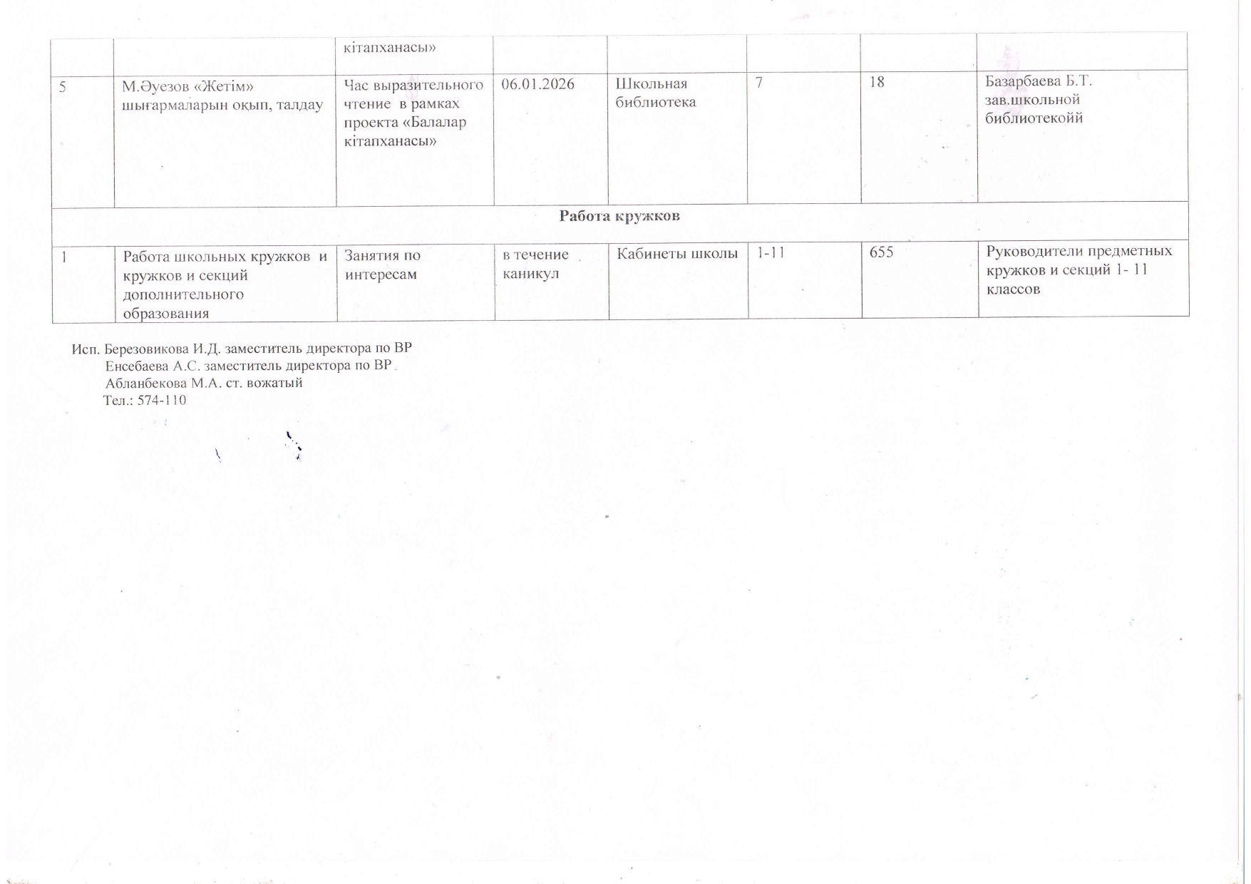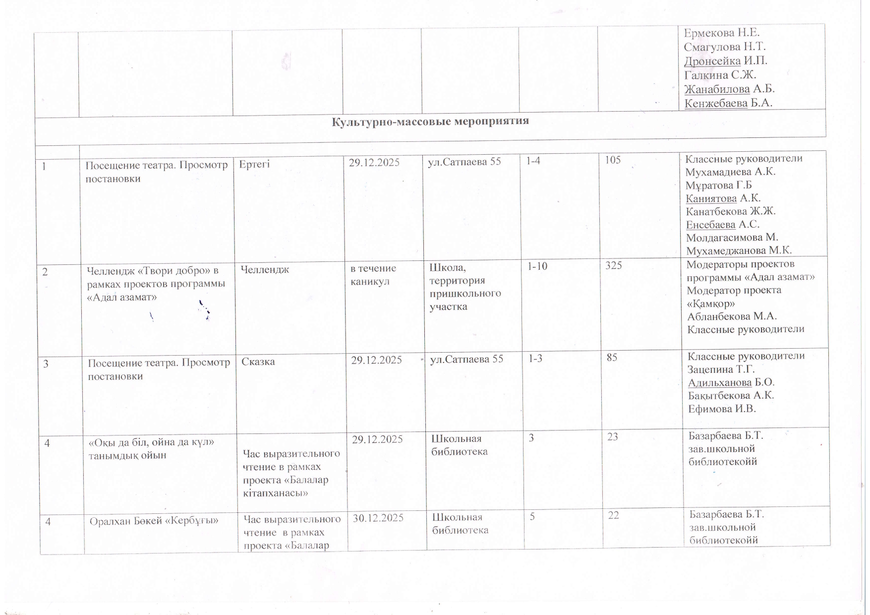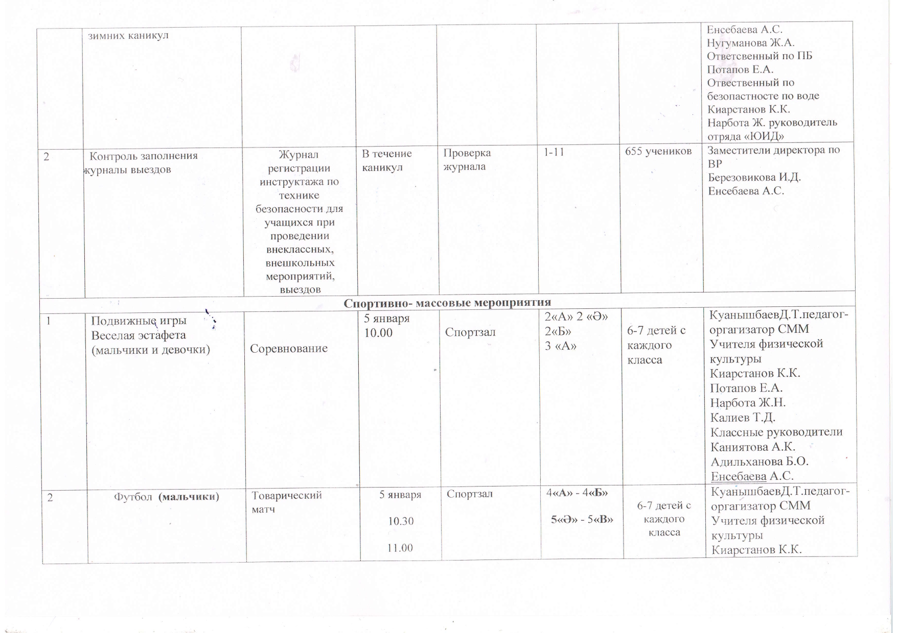 26 декабрь 2025 0 1 2 3 4 5 Қысқы демалыс жоспары План на зимние каникулы (29.12.2025 - 07.01.2026г.)